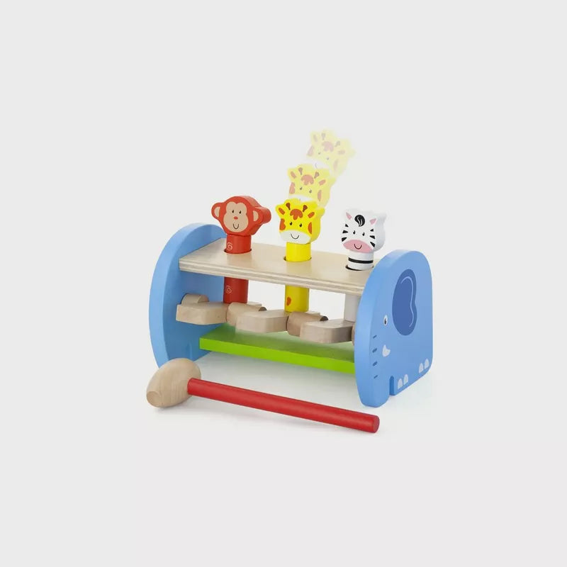 The Viga Toys 50683 Hit & Jump is an engaging wooden toy designed to enhance toddlers' motor skills, hand-eye coordination, and cognitive abilities through interactive play. This classic pounding toy features three vibrant animal heads—zebra, monkey, and giraffe—that pop up when struck with the included hammer, providing both fun and developmental benefits.