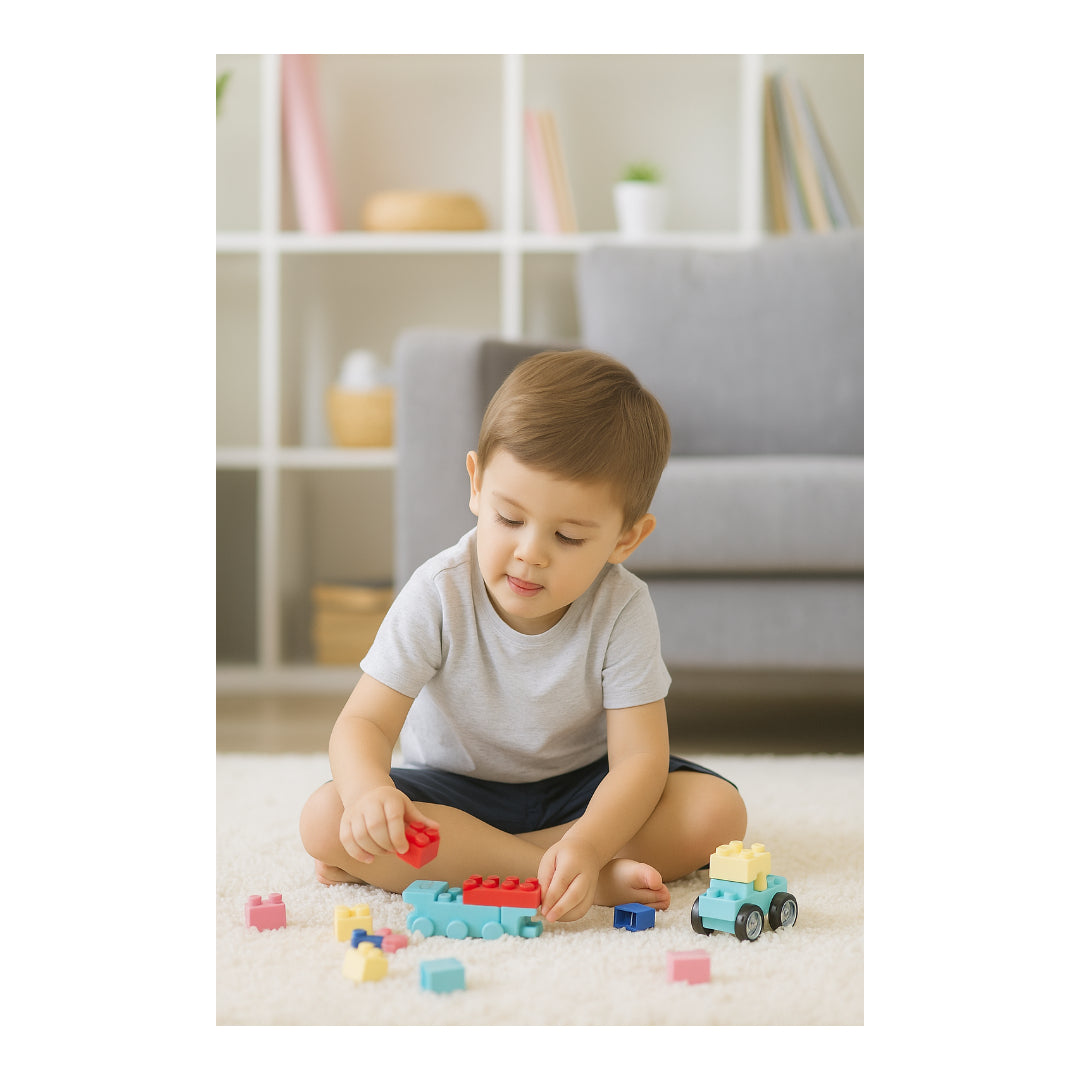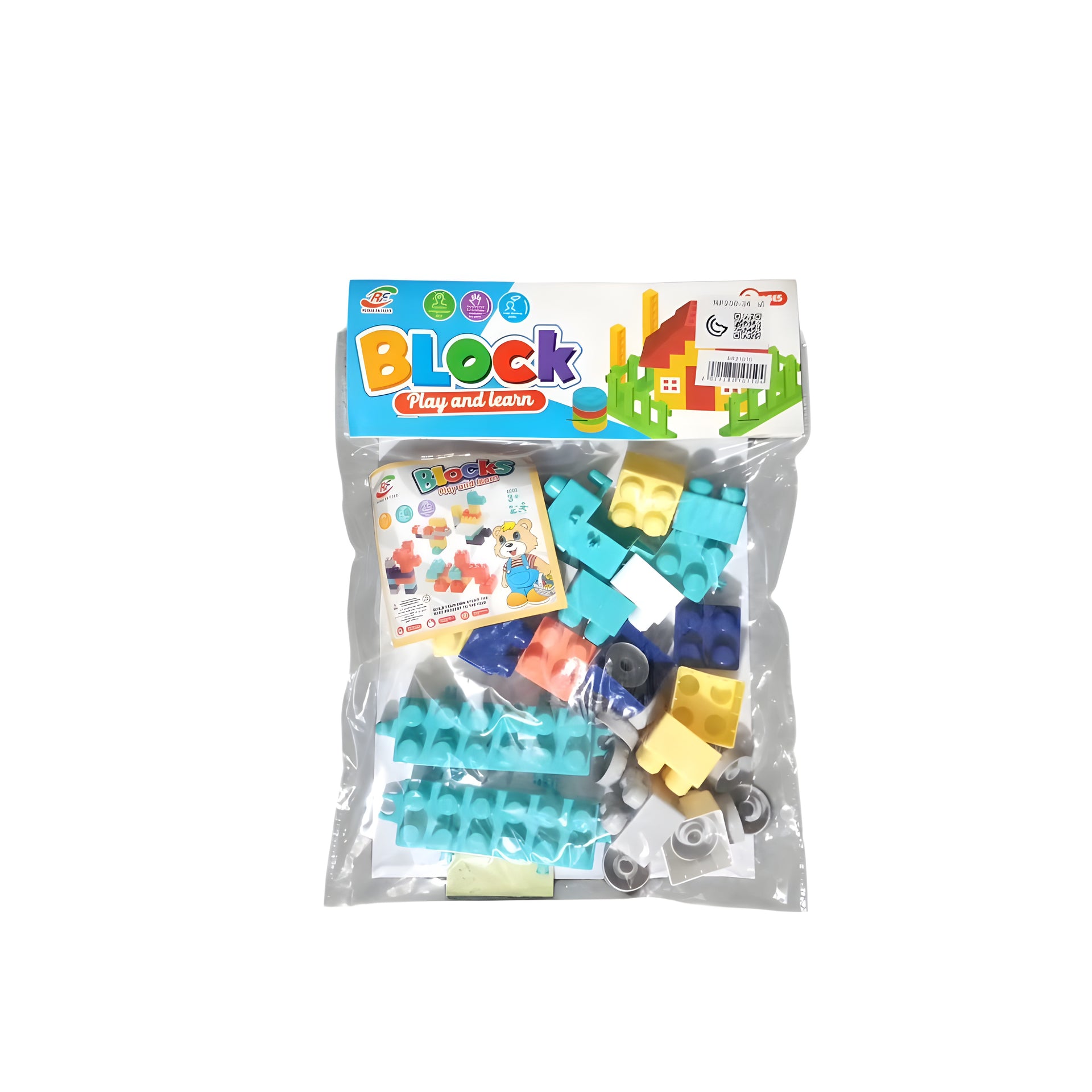 Building Block Set Packaging: Transparent plastic pouch with illustrated paper header Included Pieces: Assorted colorful plastic blocks in various sizes and shapes Wheels for vehicle assembly Mini instruction booklet with sample designs Block Colors: Blue, Yellow, Orange, Turquoise, Grey, Navy, and more Recommended Age: 3 years and up Educational Focus: Color recognition Shape identification Fine motor skill development Creativity and problem-solving Material: Durable, child-safe plastic Smooth edges to ensure safe play Benefits: Enhances spatial awareness Encourages imaginative construction play Supports STEM (Science, Technology, Engineering, Math) learning Promotes parent-child interaction and cooperative play.