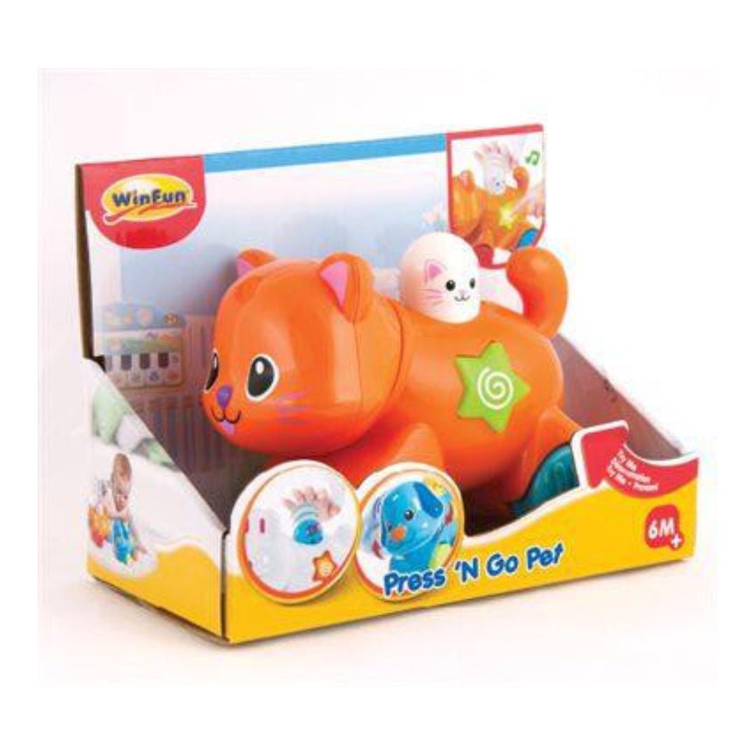 "Winfun Press 'N Go Kitten is a roll along pet friend with flashing light that will keep your little one entertained. Easy for baby to grasp and hold. You can hear different melodies when press the star button on its body. Press down button Light-up button with fun sounds and melodies.ight-up button with fun sounds and melodies