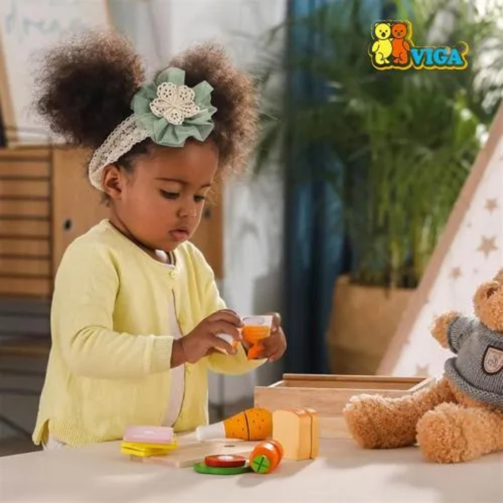 The Cutting Lunch set by VIGA Toys is a charming wooden meal playset that brings fun and educational role-playing opportunities. The set includes a wooden knife, cutting board, and a variety of foods such as bread, cheese, tomato, lettuce, sliced meat, chicken, carrot, and fish. Children can safely chop their food and learn about healthy eating while developing motor skills, coordination, and creativity. This playset is an ideal addition to any pretend kitchen, enhancing imaginative play for children aged 18 months and up.